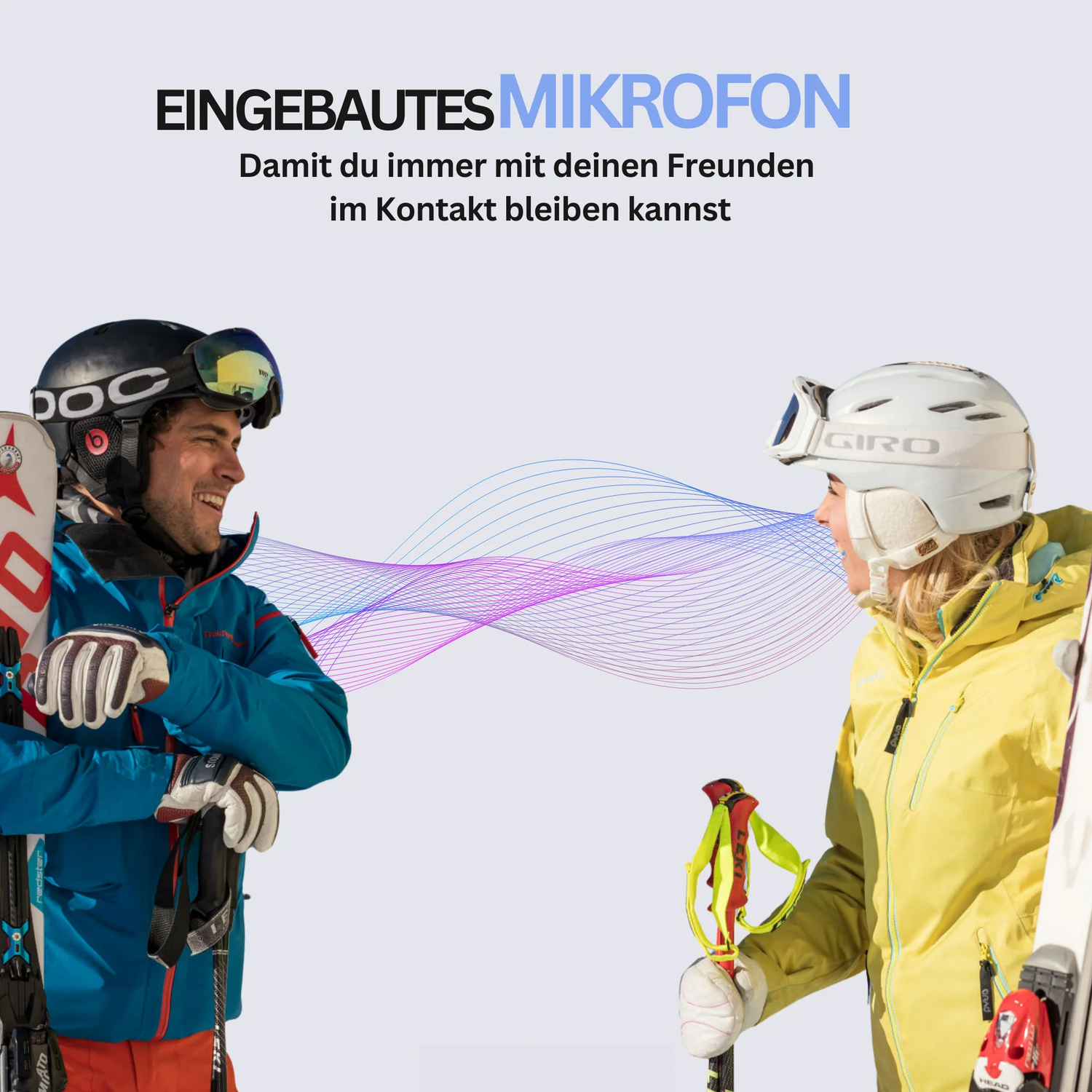 Die SkiBeats Pro sind mit einem integrierten Mikrofon ausgestattet, mit dem du während der Abfahrt mit deinen Freunden sprechen kannst.